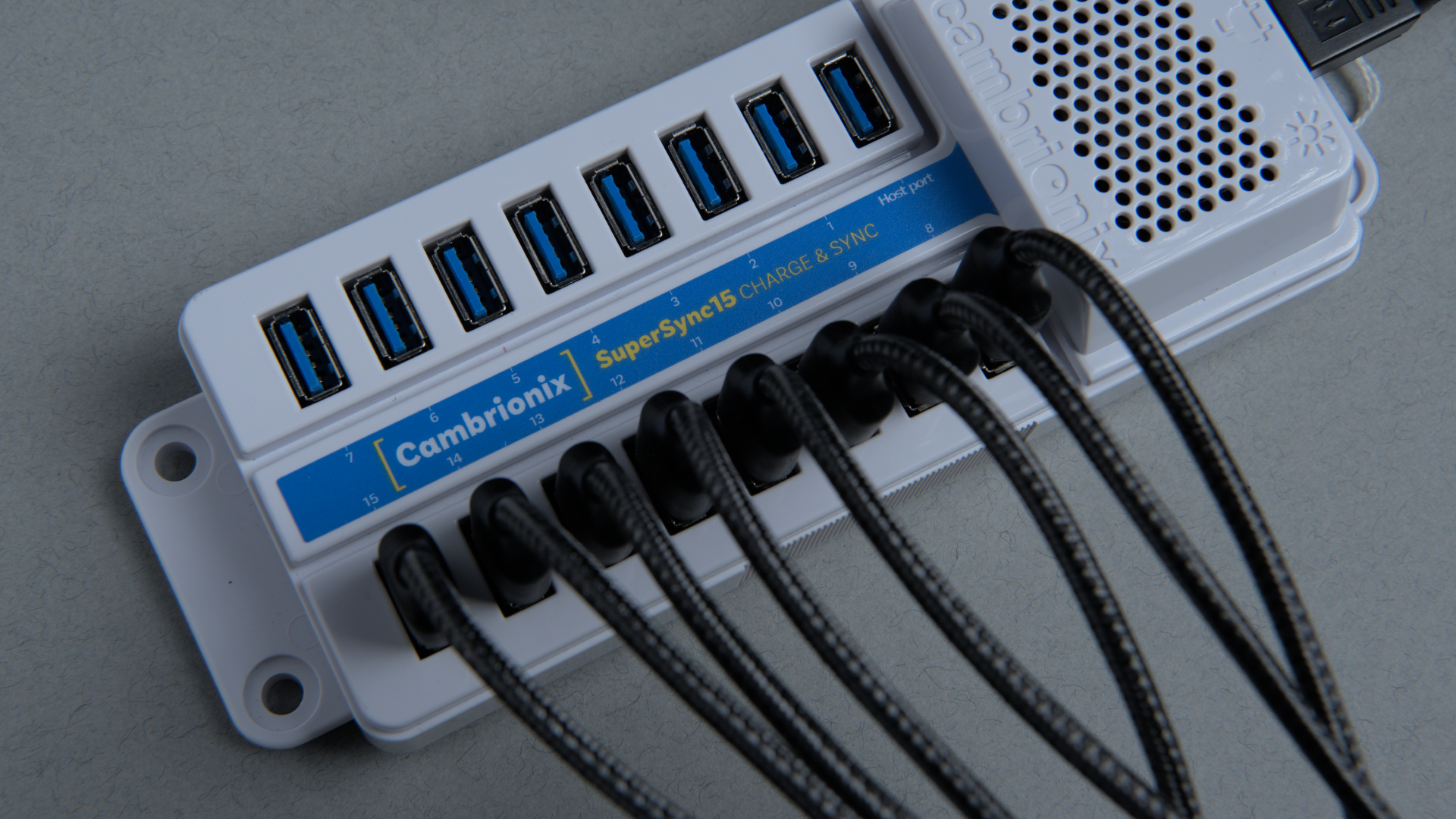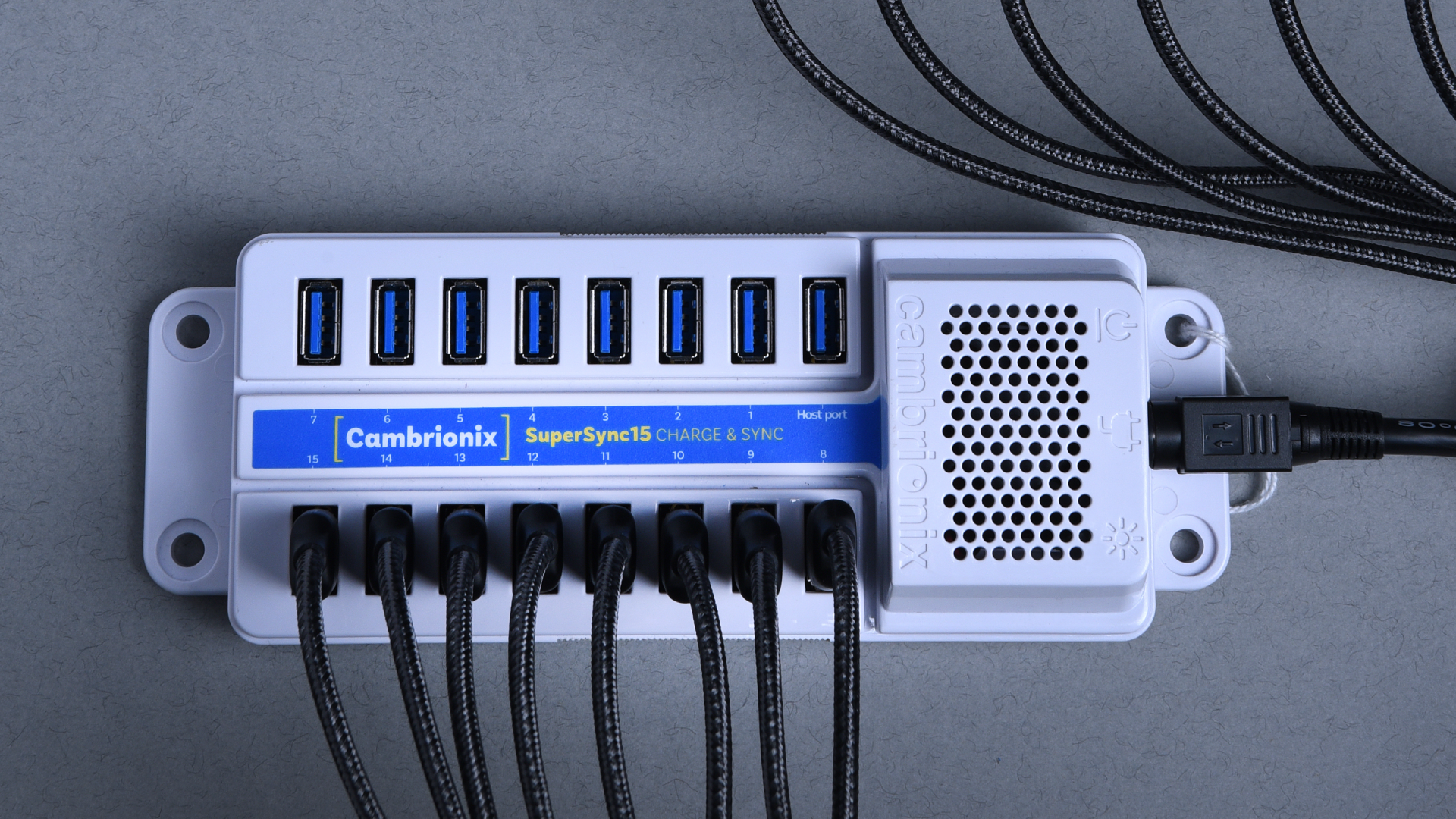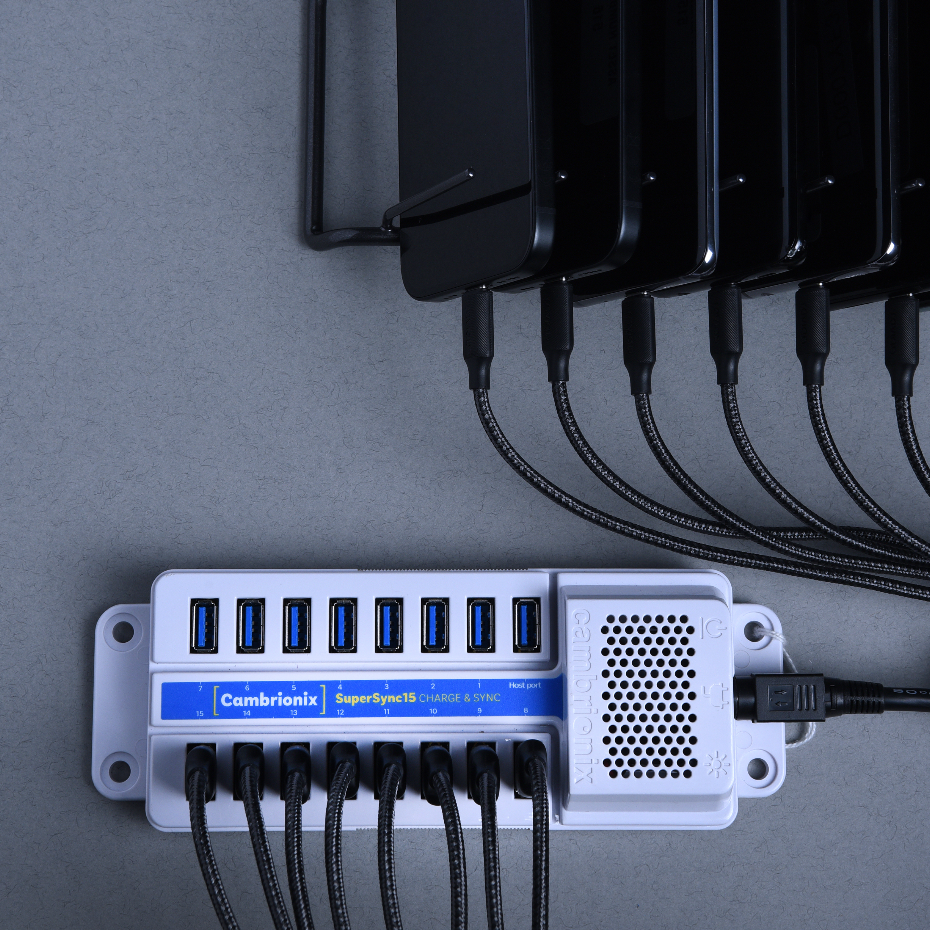 The SuperSync15 is a premium, industrial-grade, fifteen-port USB-A hub designed to charge, connect, and manage devices quickly, reliably, and safely. All downstream ports deliver a shared 5 Gbps for rapid data transfer and up to 10W power output for fast charging of devices.