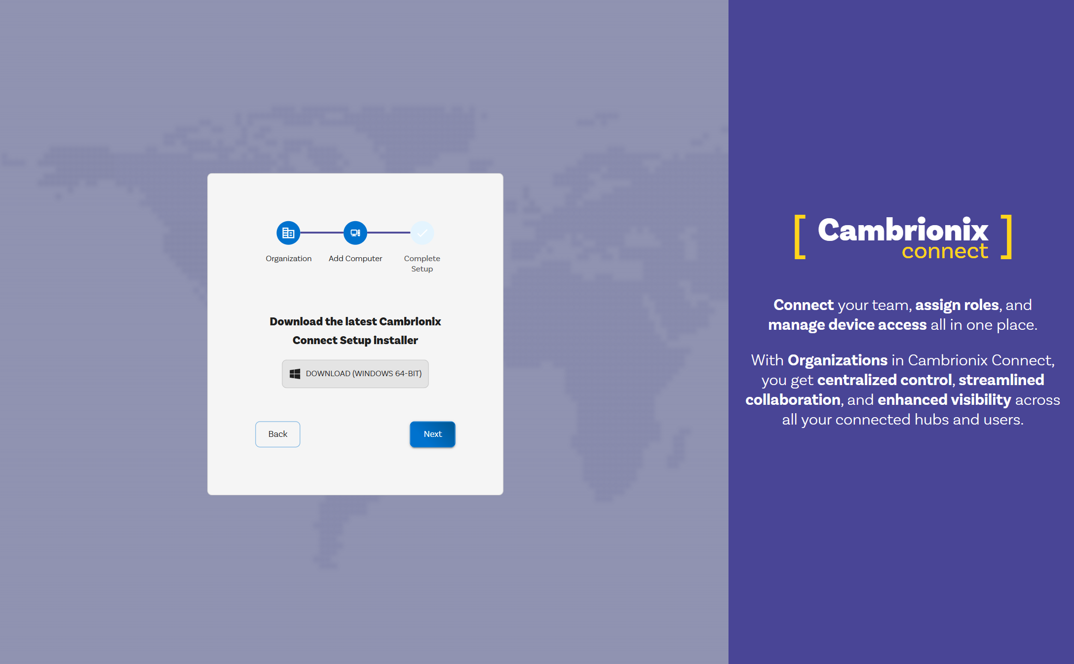 Yes. While Connect is cloud-based, each host machine needs to run Connect Suite — a bundle of Cambrionix API services that enable communication and control of attached hubs. The onboarding wizard will guide you through the installation and setup process.
