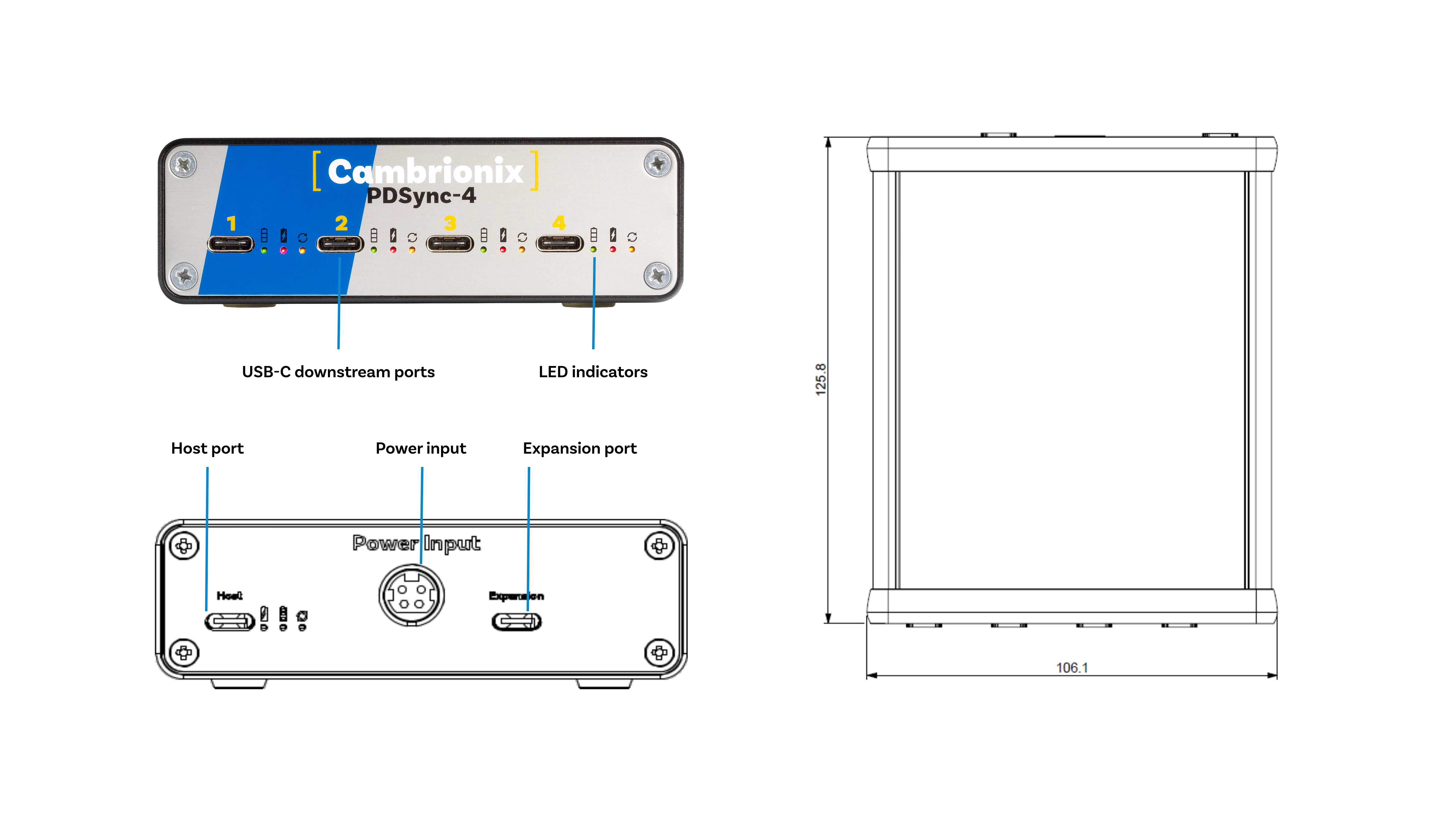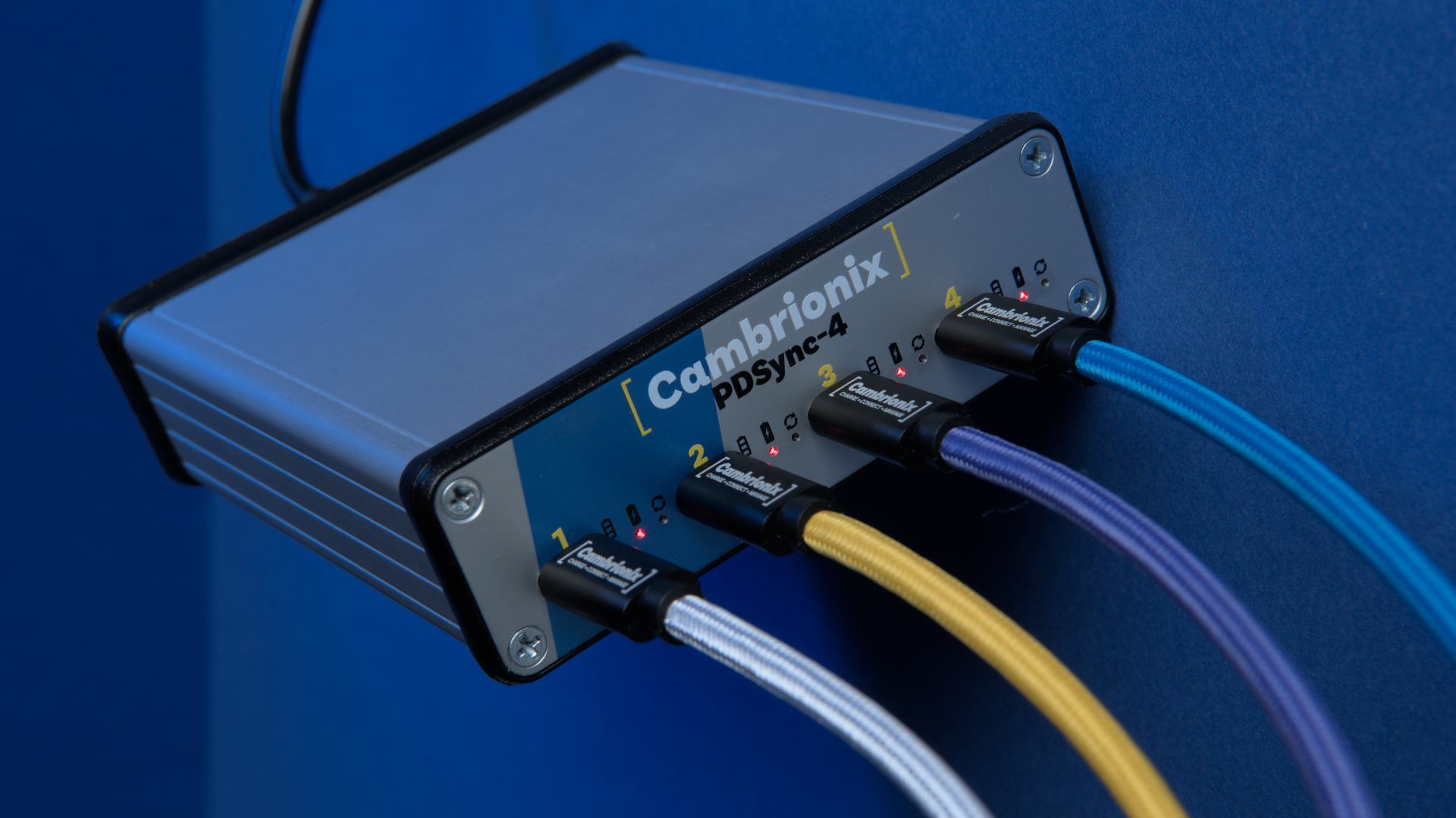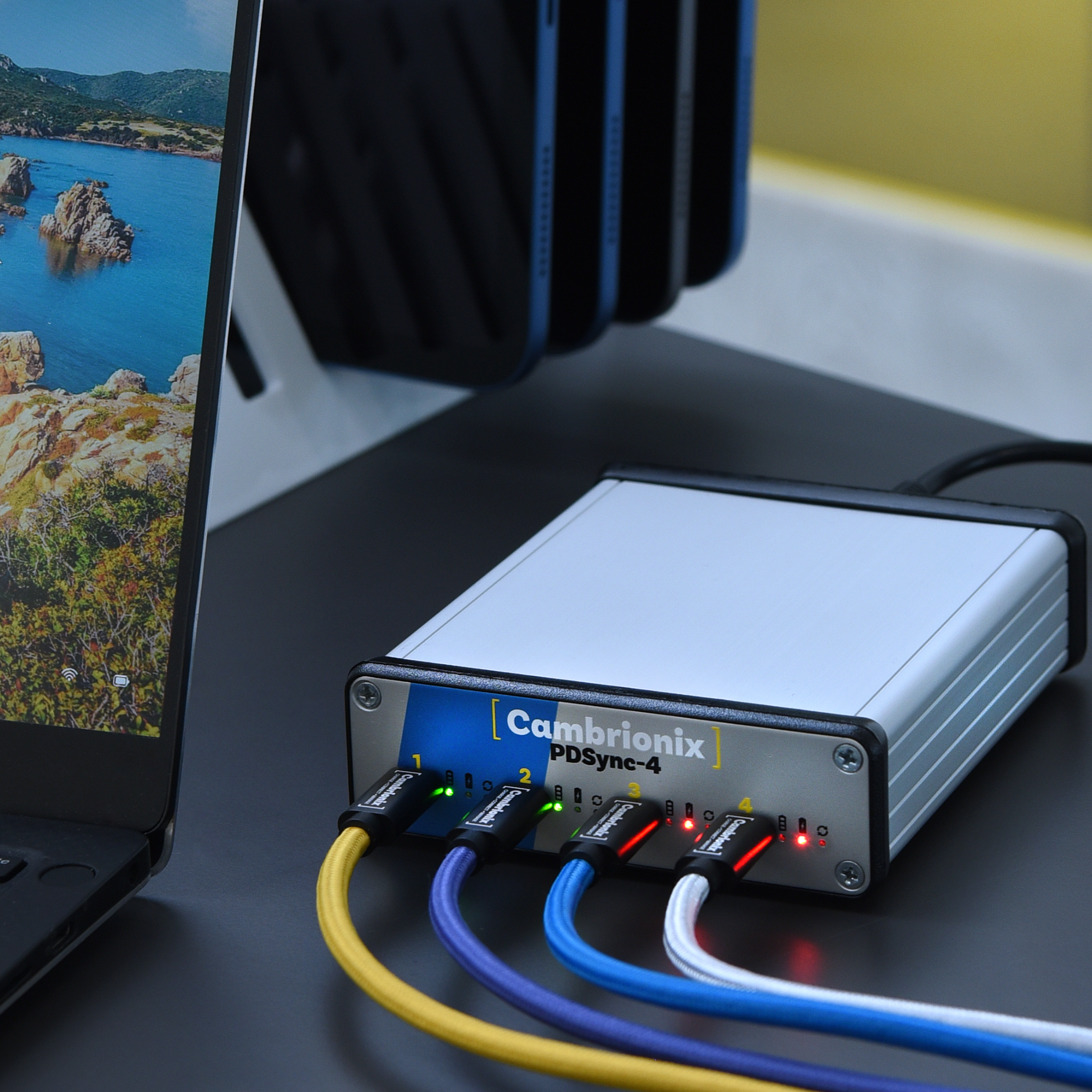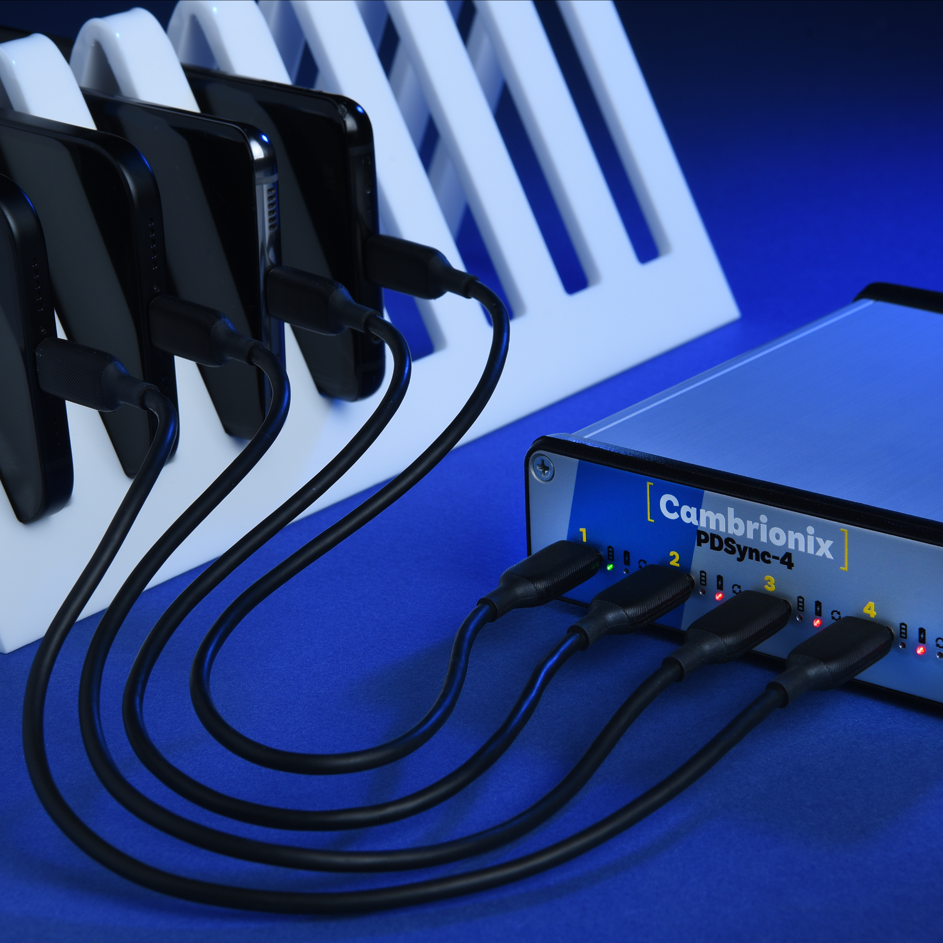 The PDSync-C4 is a premium, industrial-grade four-port USB-C hub, designed to charge, connect and manage the most power-hungry devices quickly, reliably, safely and simultaneously.